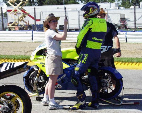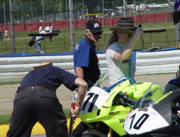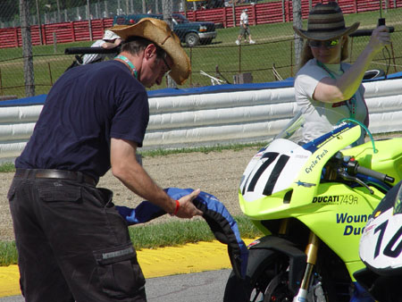 Silo Pete gives the pit-wall fans a gratuitous butt-shot, while the AMA official clearly has other things