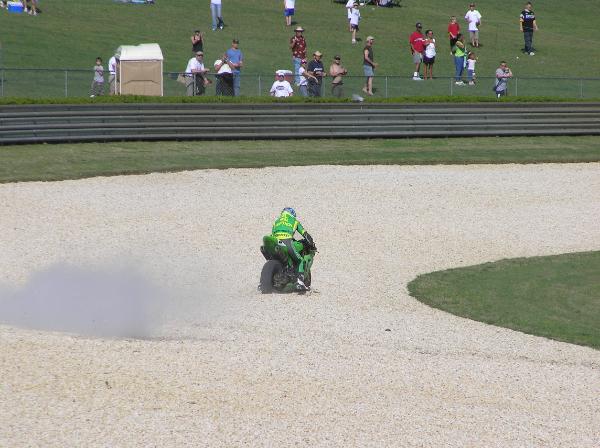 Roger Lee Hayden exiting from the gravel trap after a Turn Two crash in Superbike.